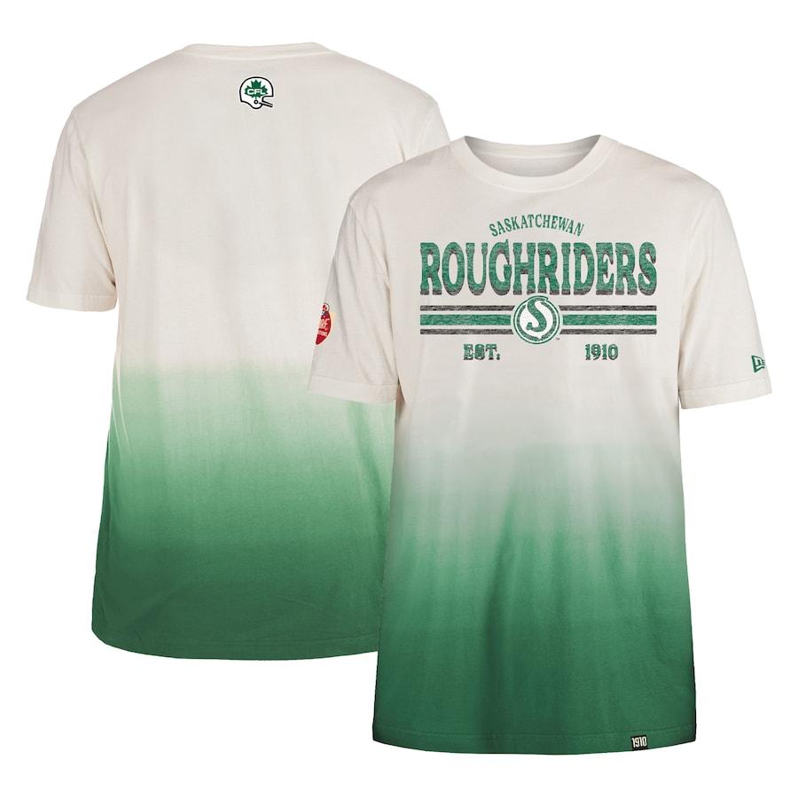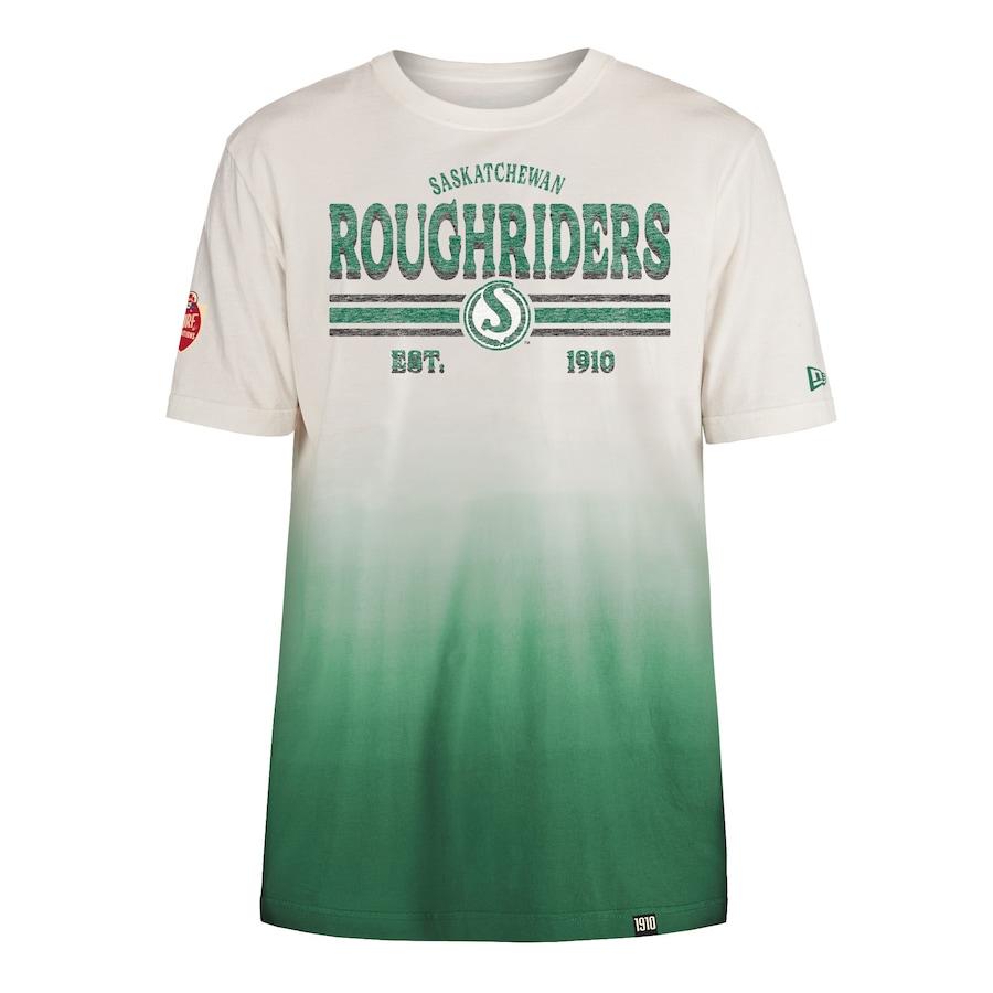 The Men's New Era Kelly Green/Cream Saskatchewan Roughriders Turf Traditions T-shirt is a must-have for devoted Saskatchewan Roughriders fans. With distressed screen print graphics and a comfortable crew neck, this cotton tee is perfect for showing Roughriders pride on game day or any day. Whether cheering from the stands or representing your team, this stylish tee supports the Saskatchewan Roughriders and the CFL.